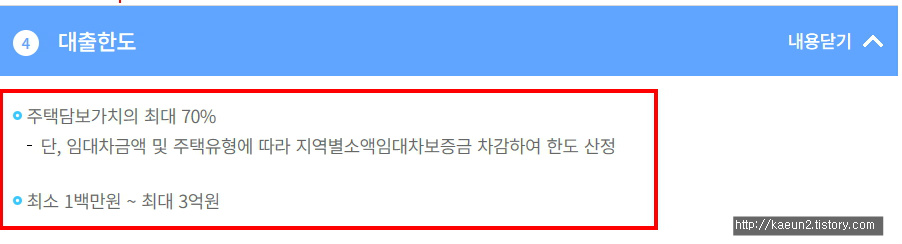 대출한도는 위와 같습니다. 최대 3억원까지 가능하며 담보가치 최대 70%까지만 대출 가능합니다.